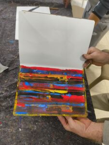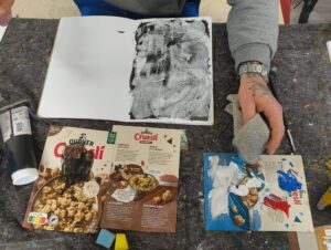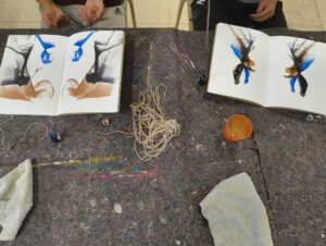 “We werken nu met een journal: een schrift met dikker papier waarin we met verf kunnen werken. Ik voorzie ook enkele ideeën en technieken die ik voordoe, zodat de deelnemers daarna zelf aan de slag kunnen. Het zijn allemaal beginfases om intuïtief schilderen en tekenen te verkennen. Zo werkten we al met touw en inkt, mandarijnschillen en verf, oliekrijt en crêpepapier.”