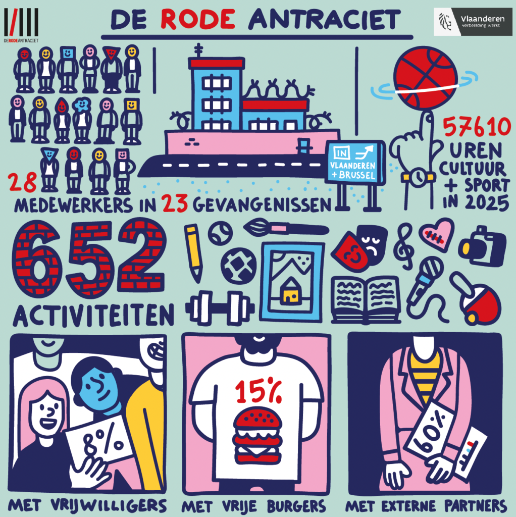 De Rode Antraciet vierde nog maar pas zijn twintigste verjaardag. Het pionierswerk van de voorgangers voegt aan het verhaal van De Rode Antraciet nog een decennium toe. In al die jaren bouwde De Rode Antraciet aan een prachtig aanbod van (sociaal-) culturele en sportactiviteiten in de Vlaamse en Brusselse gevangenissen en detentiehuizen. Met dit jaarverslag presenteert het team opnieuw een staalkaart van de dynamische werking die het in 2025 ontplooide. We hoeven de geïnteresseerde lezer er niet van te overtuigen dat het werk in de penitentiaire instellingen verre van evident is. De precaire toestand in de gevangenissen is de voorbije jaren niet uit de media geweest. Deze context, maar recent ook de onzekerheden bij de medewerkers van De Rode Antraciet over de toekomst, maken het werk er niet gemakkelijk op.